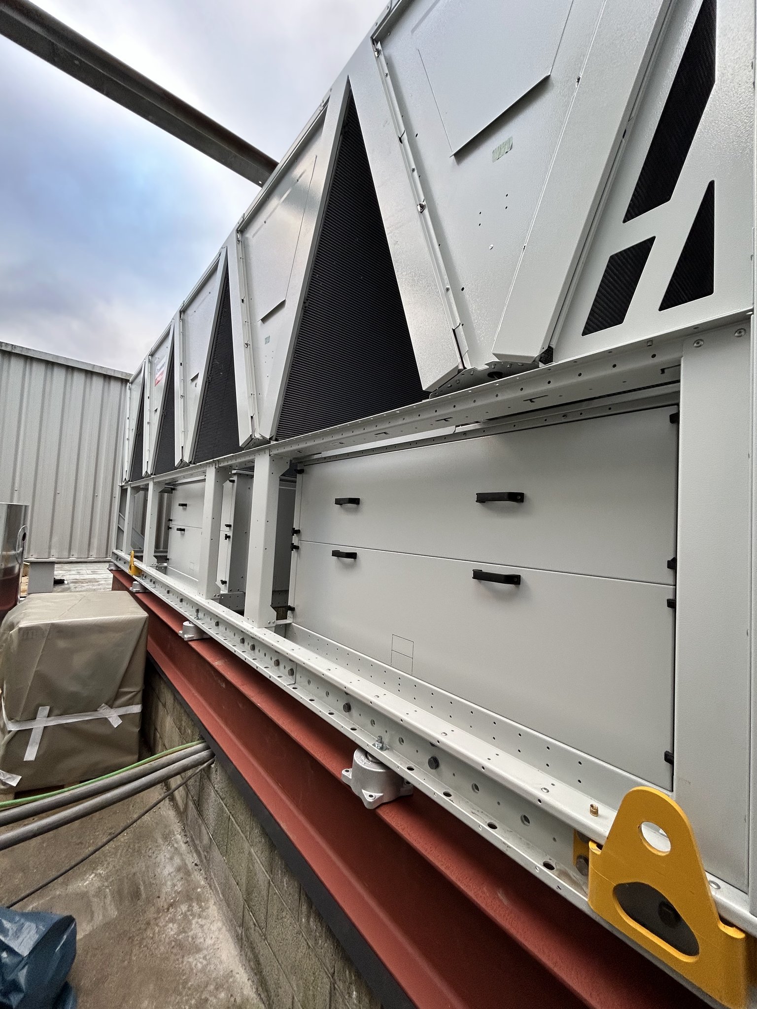 Démontage du chiller défectueux et mise en place d'un nouveau groupe de chez Mitsubishi Electric.