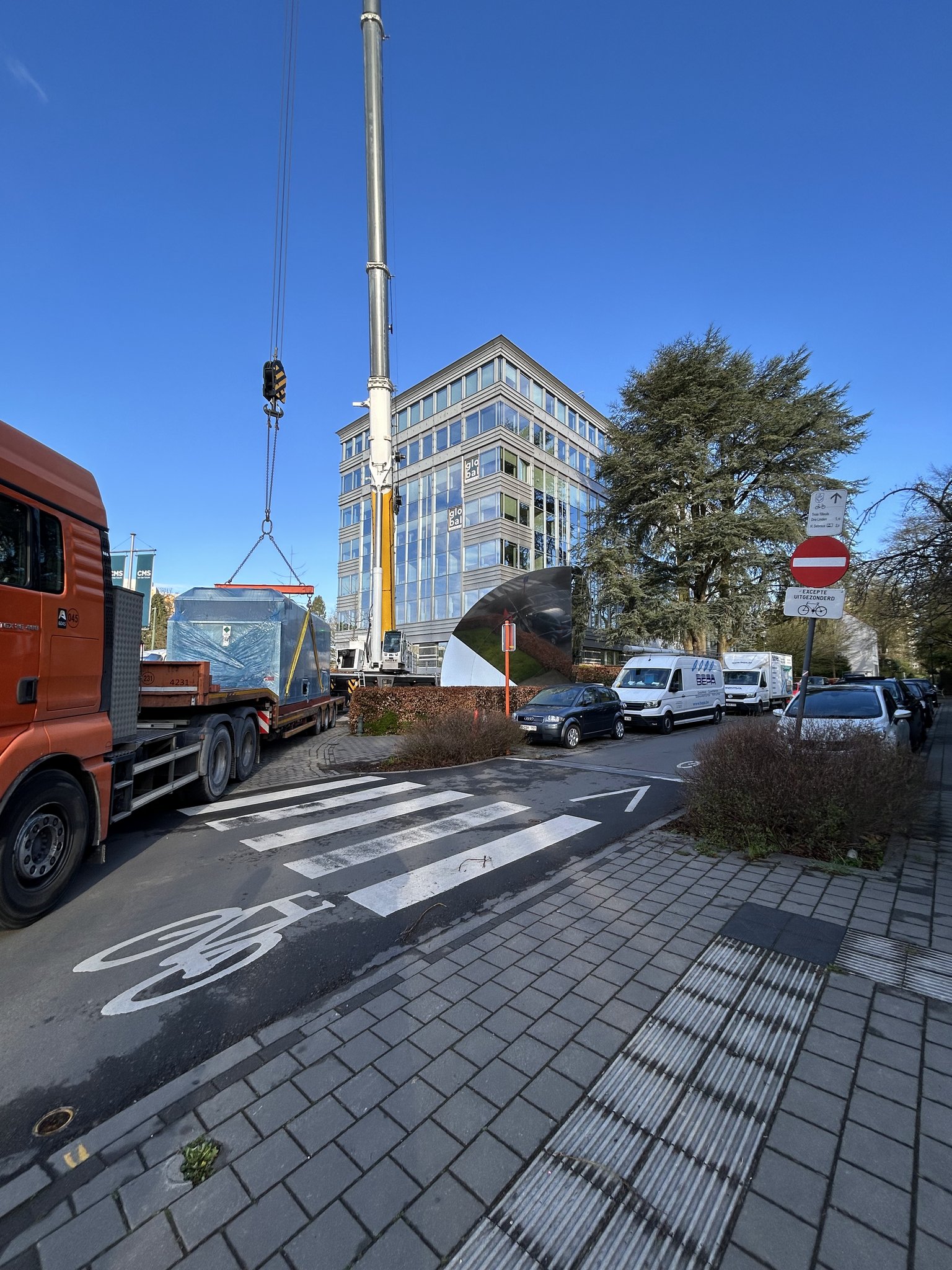 Pour cette intervention, une grue télescopique de notre partenaire Aertssen – Michielsen a été mobilisée afin de permettre la dépose et la mise en place du nouvel équipement en toute sécurité. Les manœuvres se sont déroulées avec précision et maîtrise, garantissant la continuité des installations et le respect des délais.
